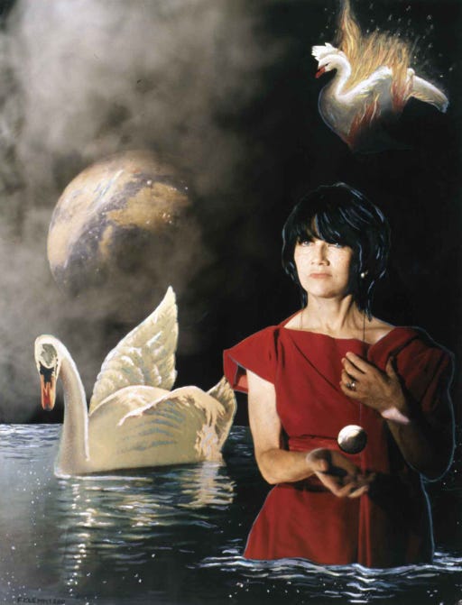 Hace un par de semanas inauguró una muestra con obras de Mildred Burton y Federico Klemm. El título de la exhibición es El cisne en llamas y se mete con la historia de la amistad entre estos dos personajes. Todo en la sala es bastante delirante y muchas piezas las hicieron juntos, colaborando el uno con el otro. Hay grandes pinturas para techo, una serie de imágenes del departamento de Federico intervenidas por Burton y un retrato que Klemm le hizo a ella –de ahí surge el título de la muestra–.